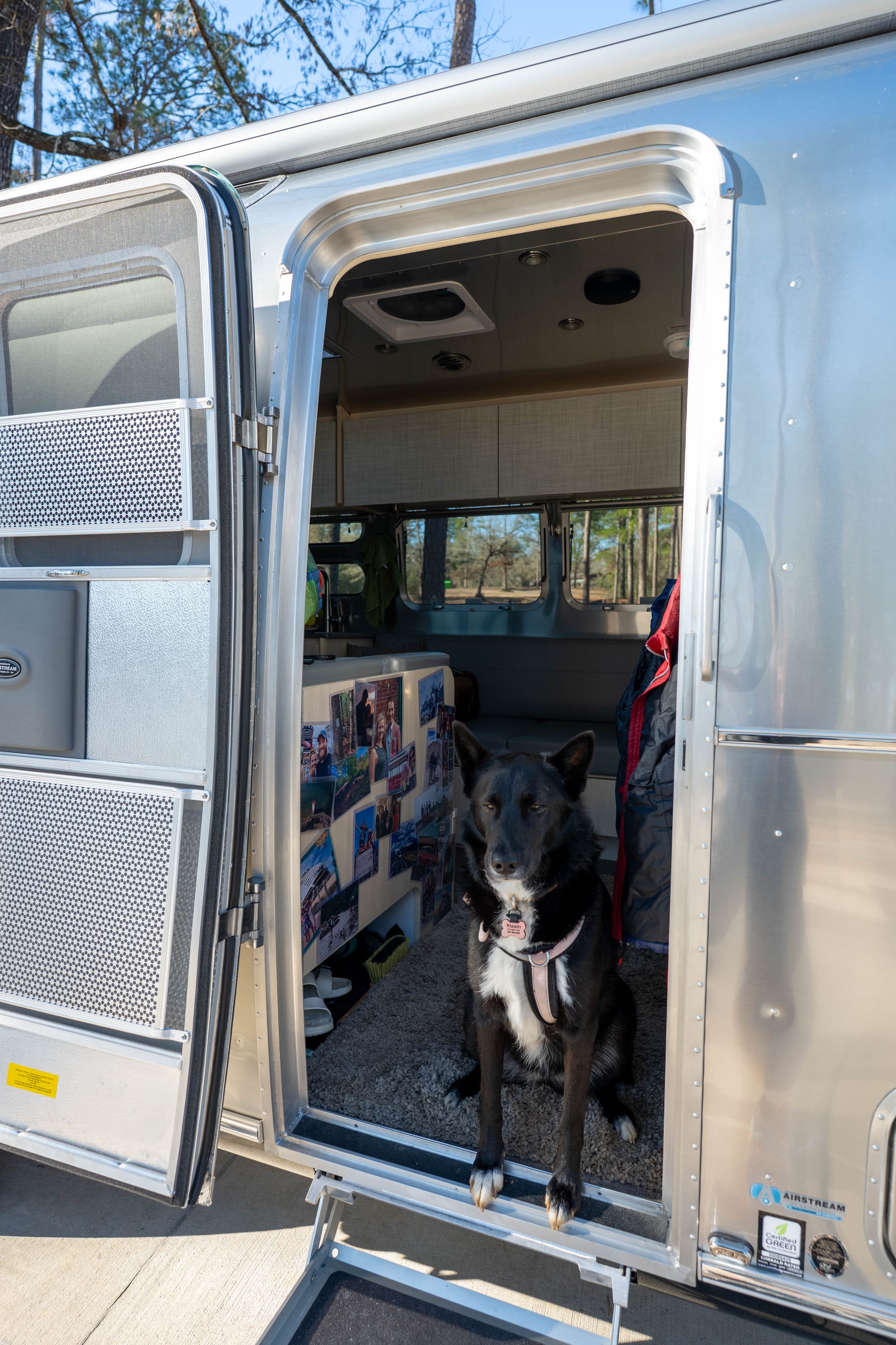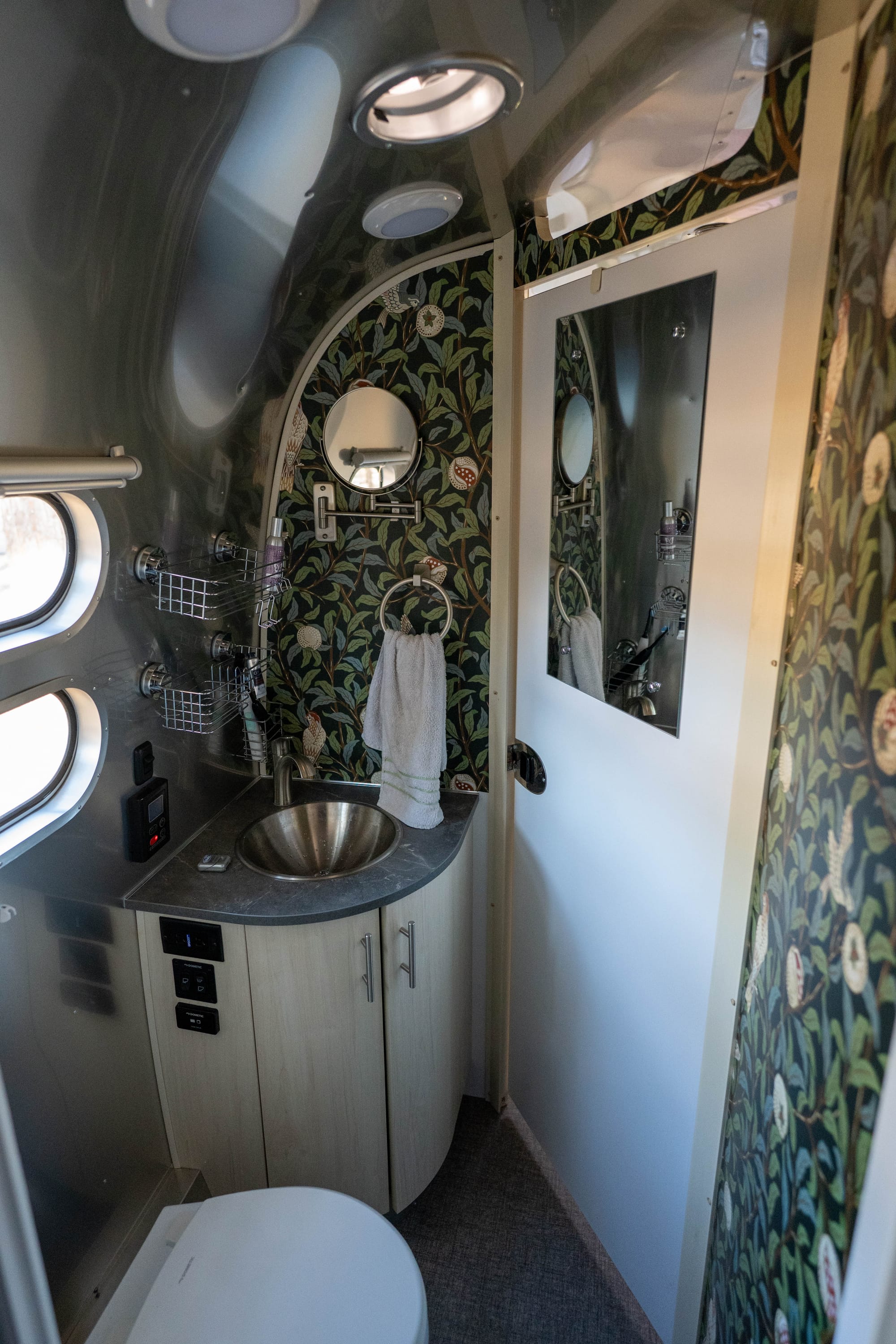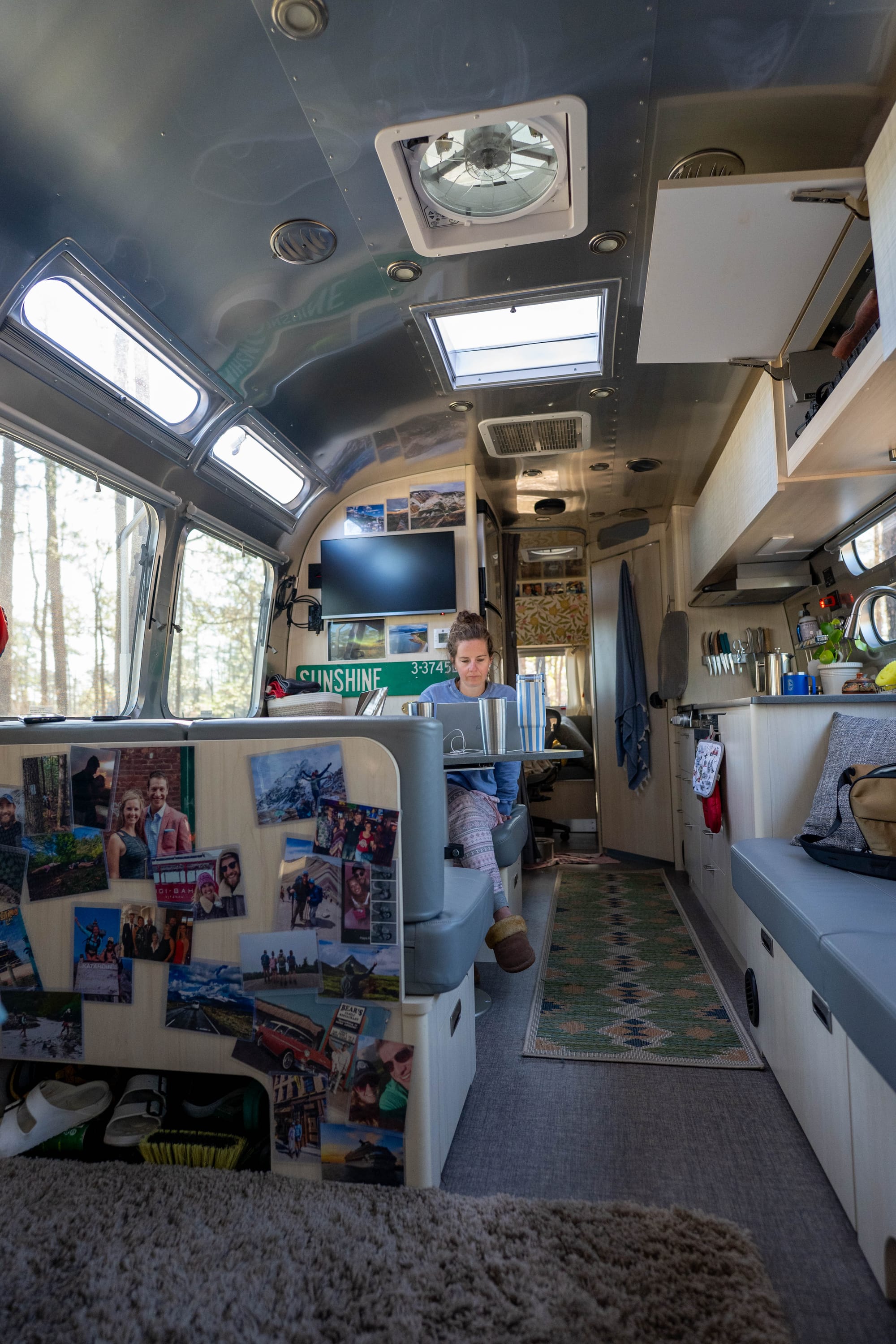 We also learned the interior can go either direction. Modern and clean, or more personal and lived-in. We love the aluminum look, but we didn’t want the inside to feel sterile, so we made changes early. Photos up, vinyl wallpaper over the cabinets, and updates in the bathroom. Not to turn it into something else, just to make it feel like home.