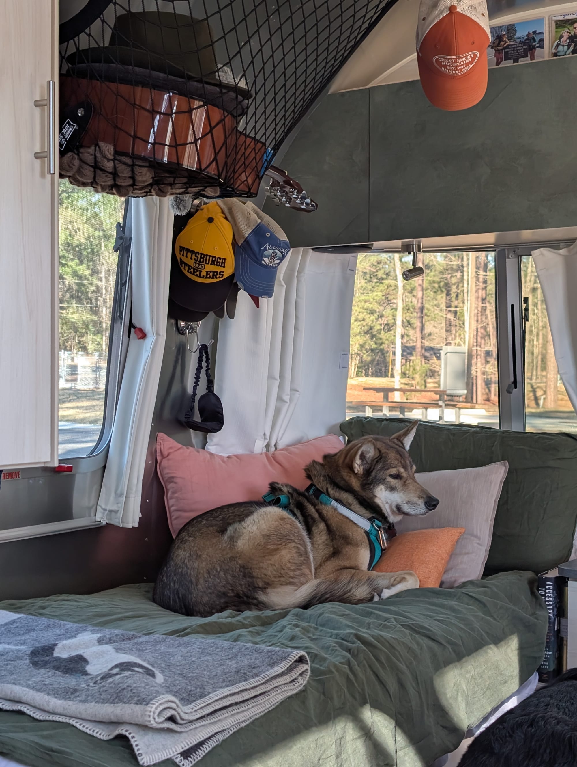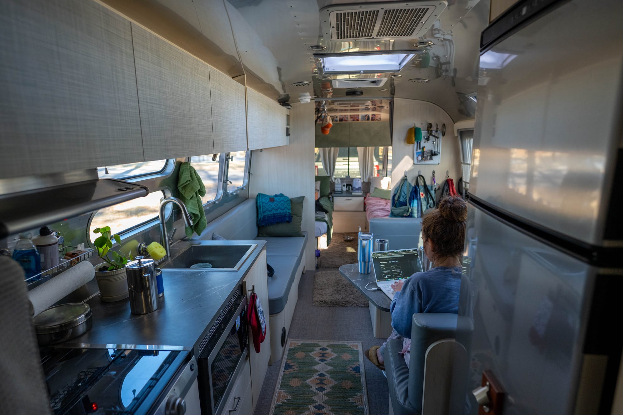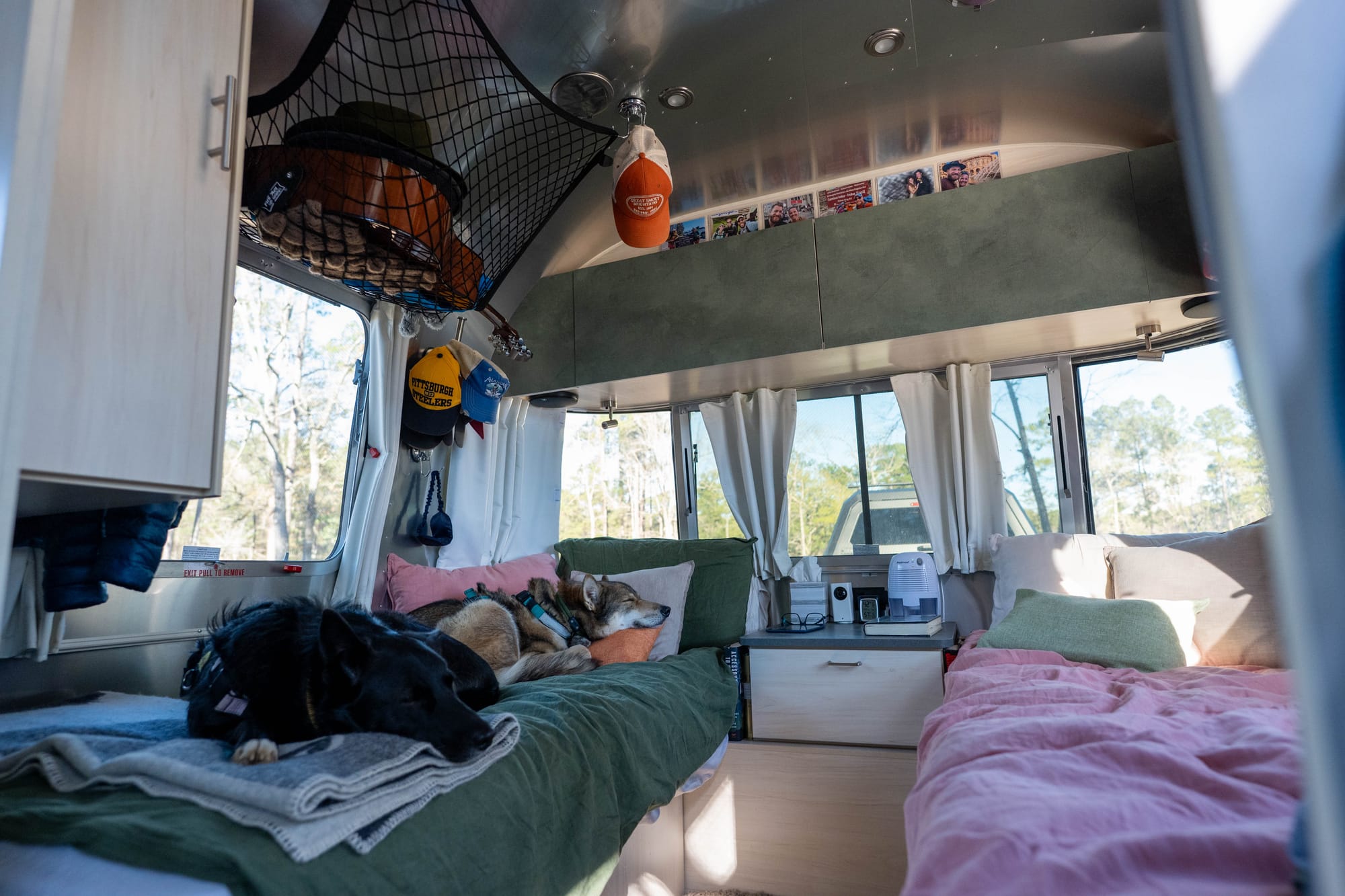 We also learned the interior can go either direction. Modern and clean, or more personal and lived-in. We love the aluminum look, but we didn’t want the inside to feel sterile, so we made changes early. Photos up, vinyl wallpaper over the cabinets, and updates in the bathroom. Not to turn it into something else, just to make it feel like home.