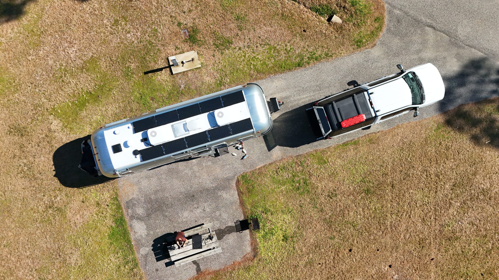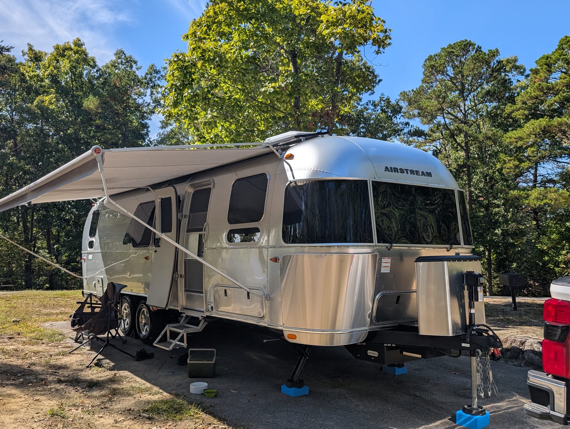 Our rig is a 2025 Airstream Flying Cloud, the 30' Office floor plan with a front bed (twin) setup. On paper it’s a manageable trailer. ~5,650 lbs dry, ~1,650 lbs net carrying capacity, with a 7,300 lb GVWR. In real life, behind Jolene, our 2024 F-250 King Ranch diesel, it pulls like it’s not even there.