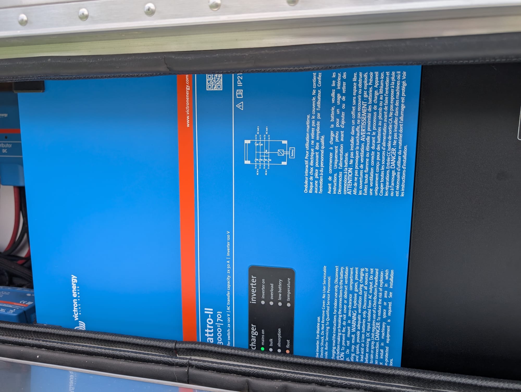 - An onboard Onan generator that can feed the Quattro for high-rate charging and AC loads.