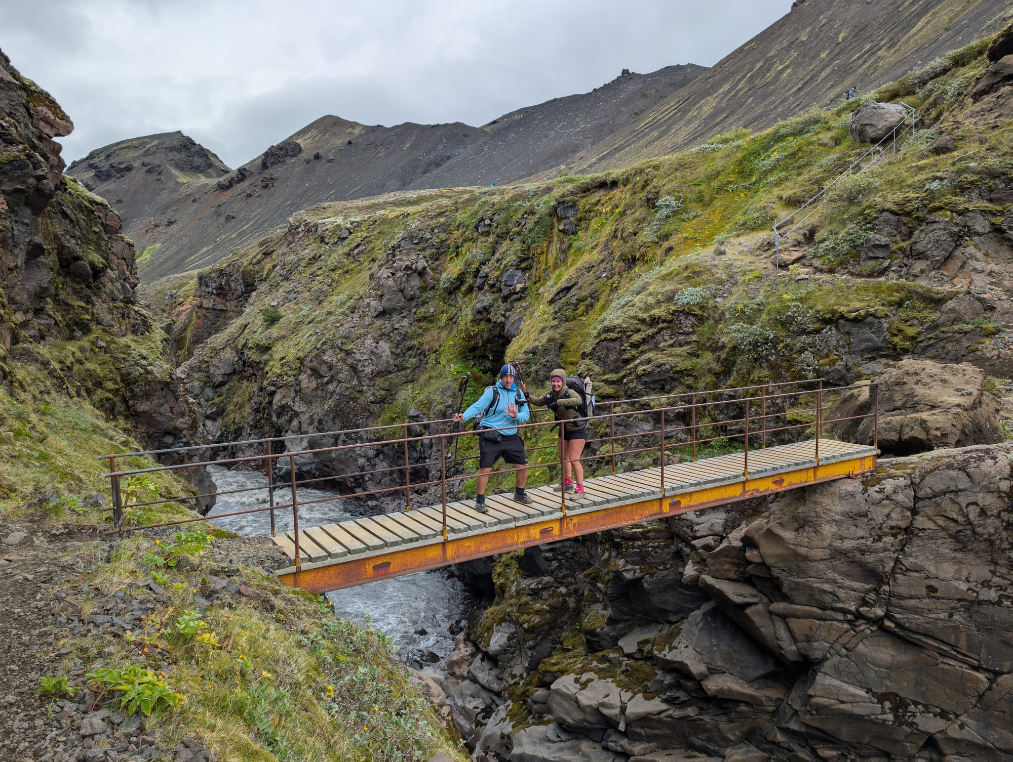 We left Emstrur-Botnar and the trail immediately felt different. More defined tread, more obvious elevation change, and more moments where you’re walking with a canyon at your side instead of across open flats. The footing shifted too. Less “pick your line across black grit” and more actual trail, with a few slick sections that kept us paying attention.
