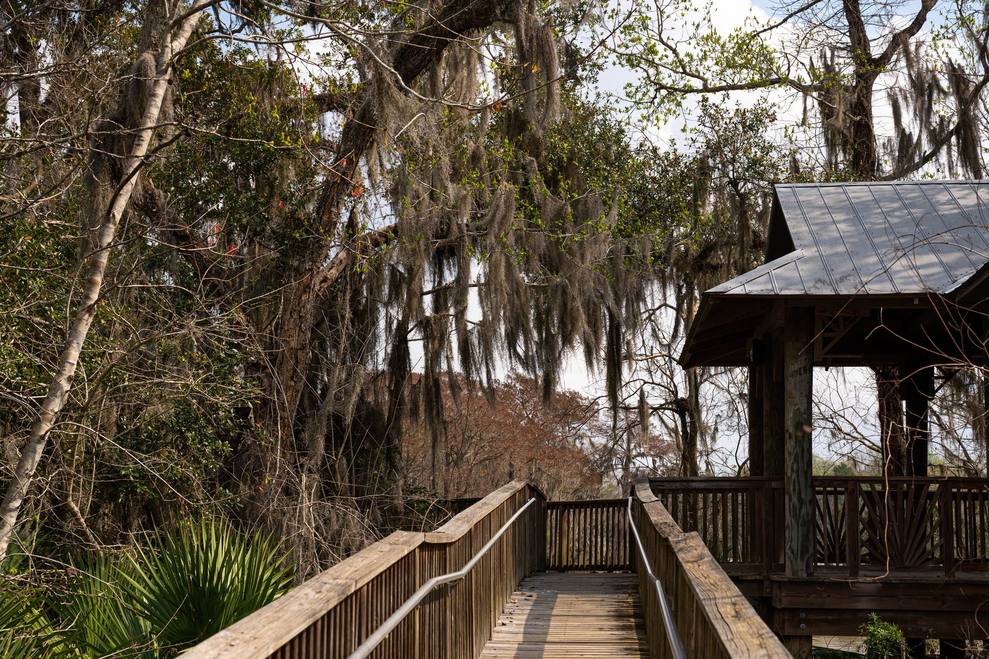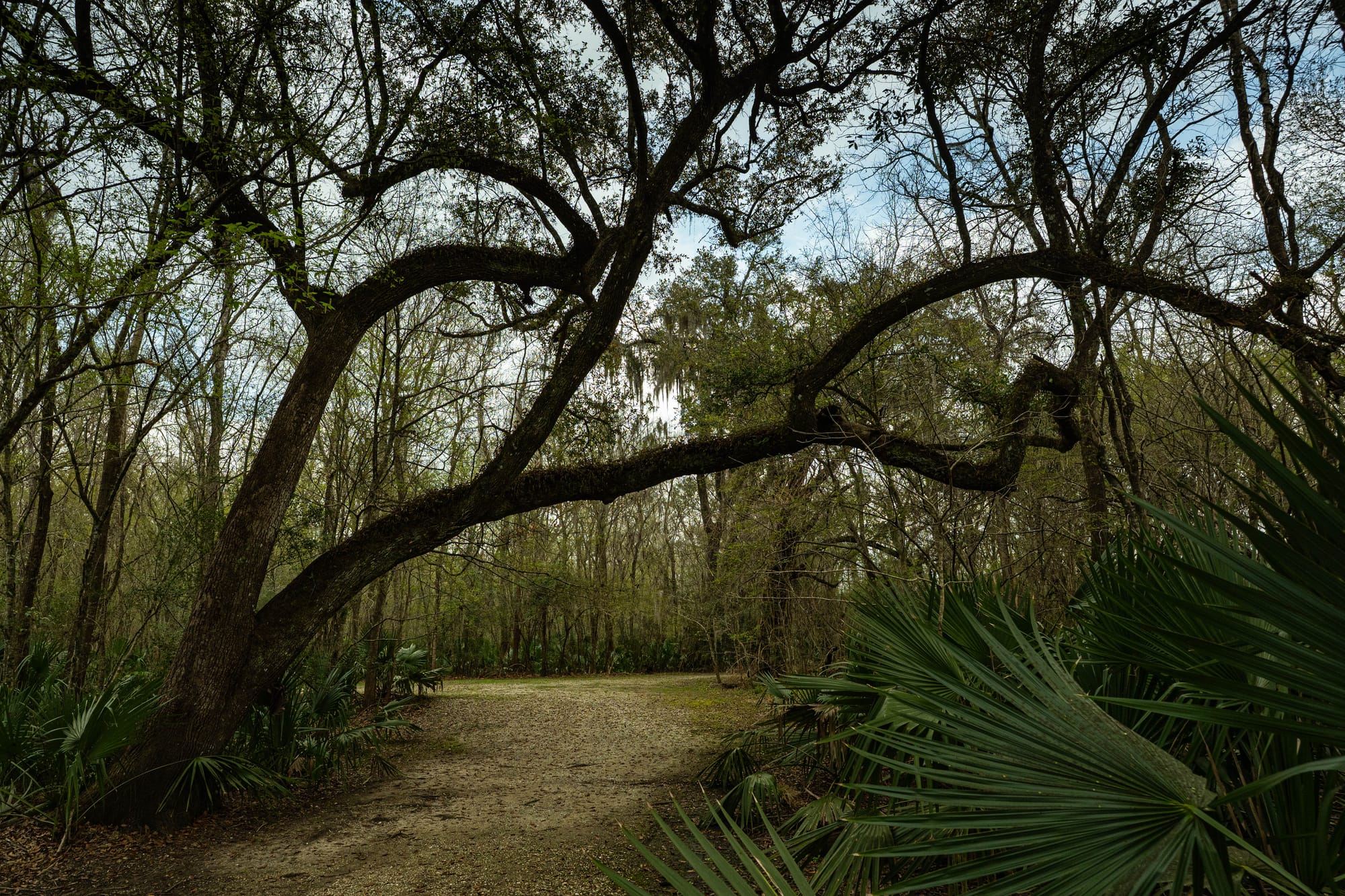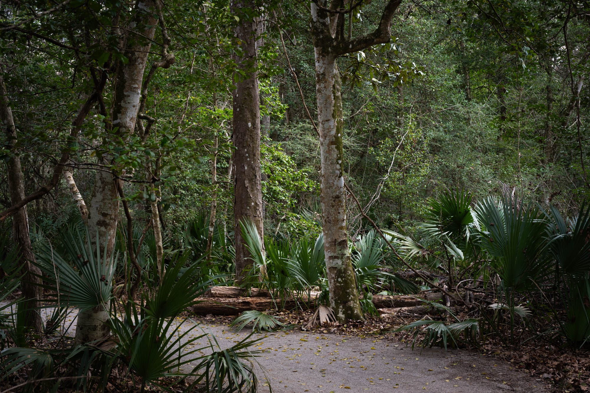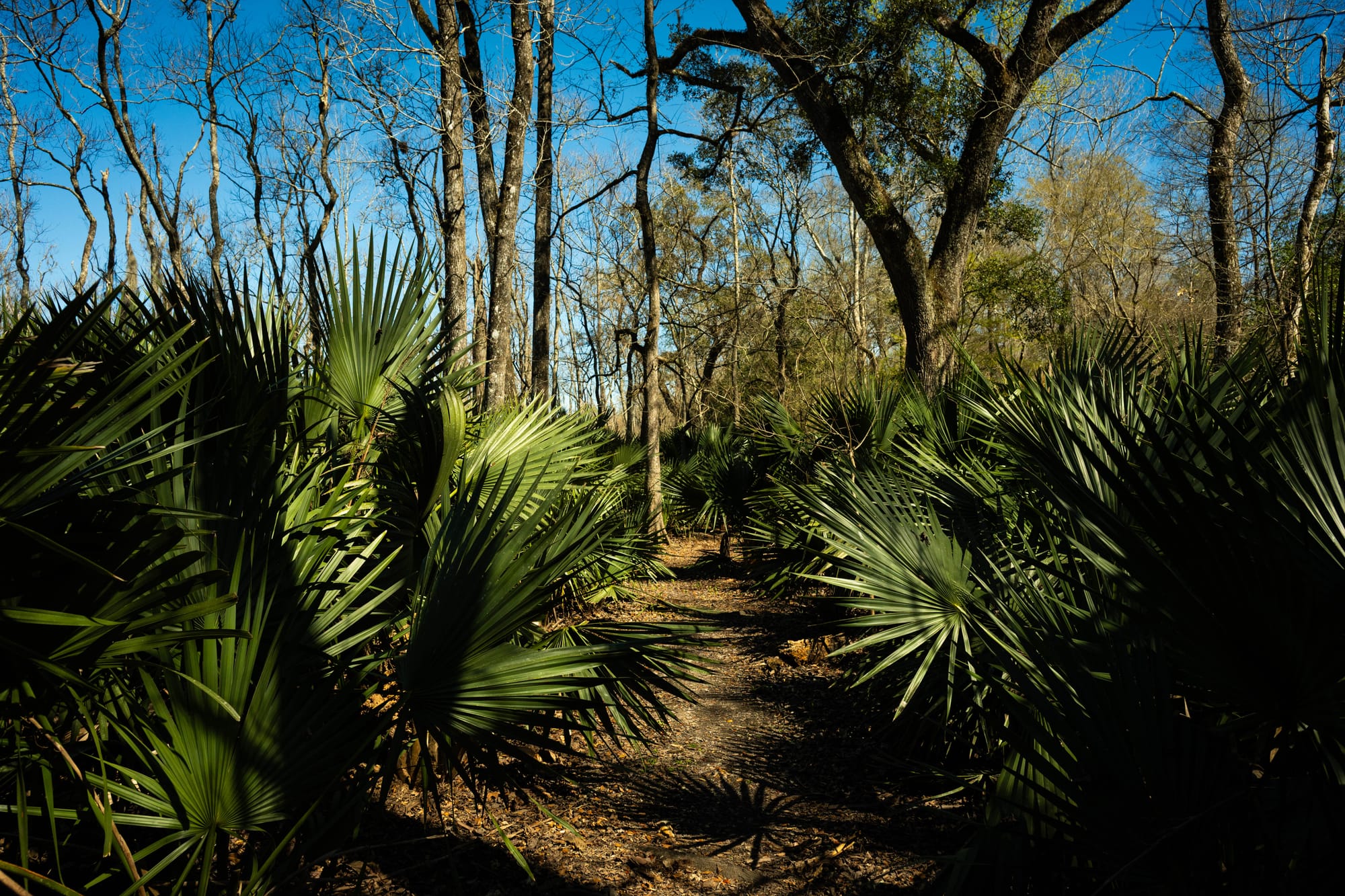 The trees carry a lot of the experience here. The palmettos create a dense understory and the bigger hardwood canopy gives the place that older Gulf Coast character. When the sun is low, the light catches the trunks and the waterline at the same time, and the whole place feels calmer and more detailed.