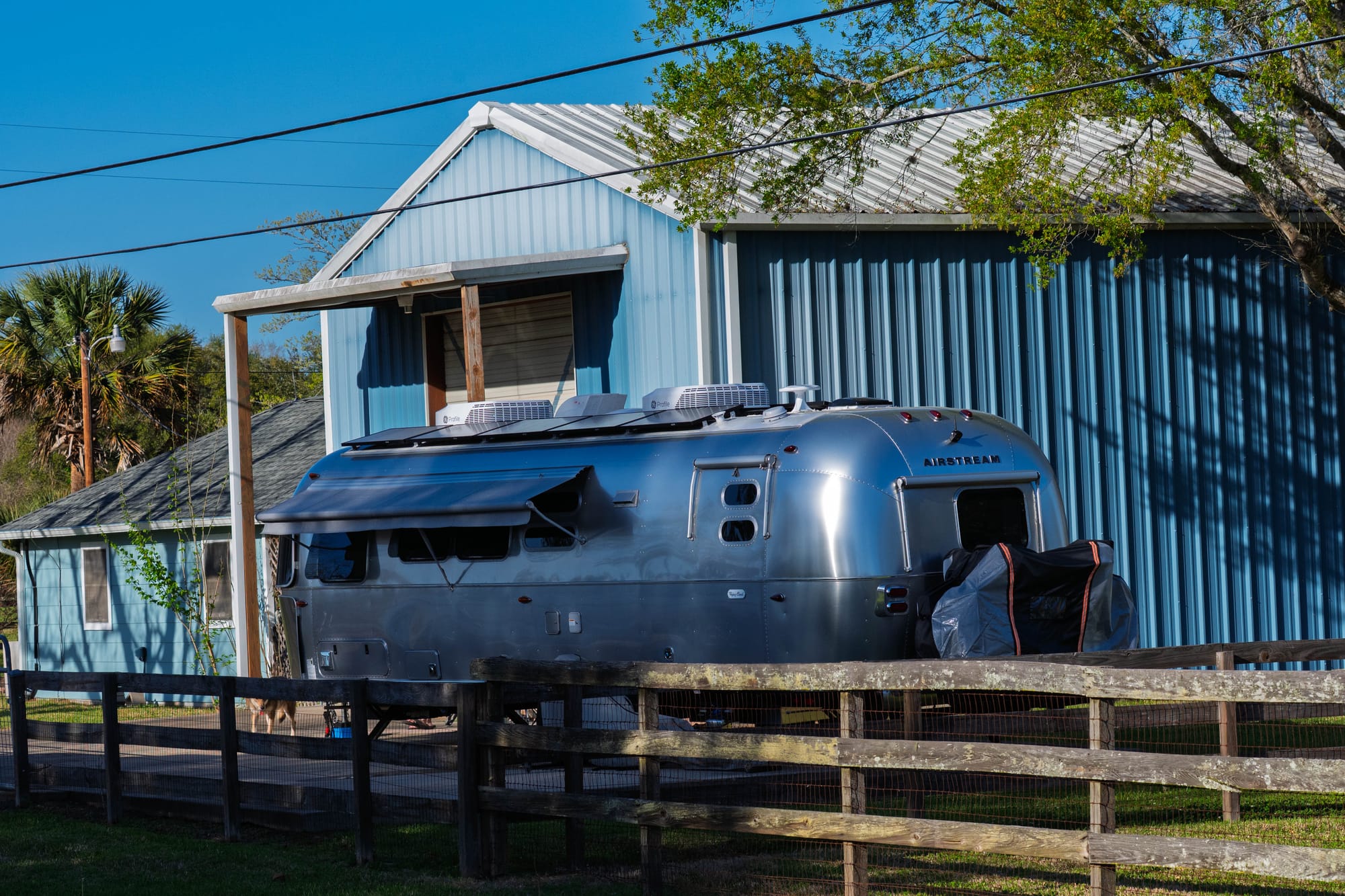 We set up behind a large barn at the back of her property. There’s a wide concrete pad with power, positioned far enough from the house that it feels like its own space. Easy to get in, easy to settle.